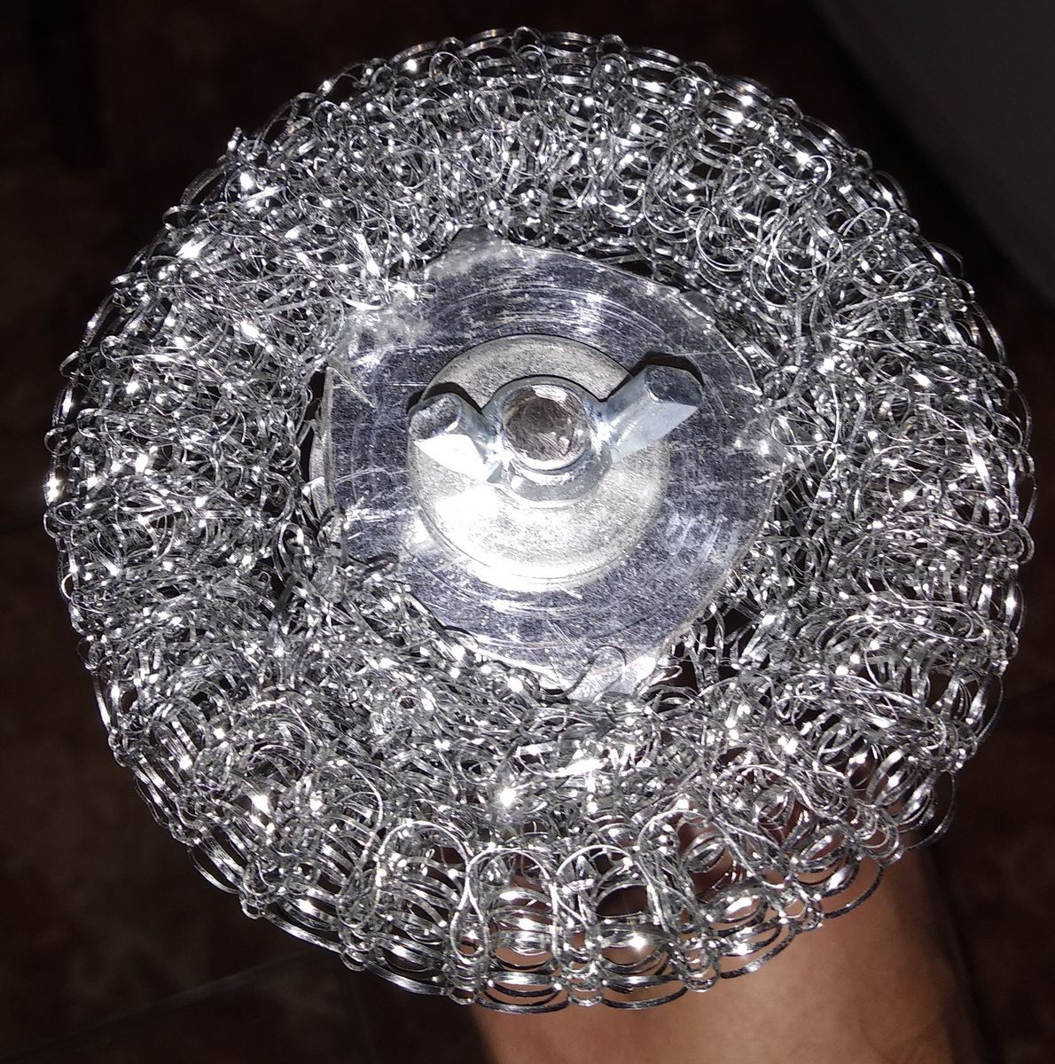 Мой коротенький отчет. Смастырил и я приспособу для чистки труб. В качестве держателя была использована алюминиевая трубка от старой лыжной палки с внутренним диаметром 10мм. В нее вставил резьбовую шпильку М8. Часть резьбы на шпильке, которая входит в трубу обстучал молотком до прямоугольника в сечении и прорезал паз. Вставил шпильку, расклепал трубку и в паз вкрутил болтик для пущей надежности. Вырезал из жестянки две шайбы. Между шайбами устанавливается обычная металлическая губка. Сегменты труб вычищает отлично.