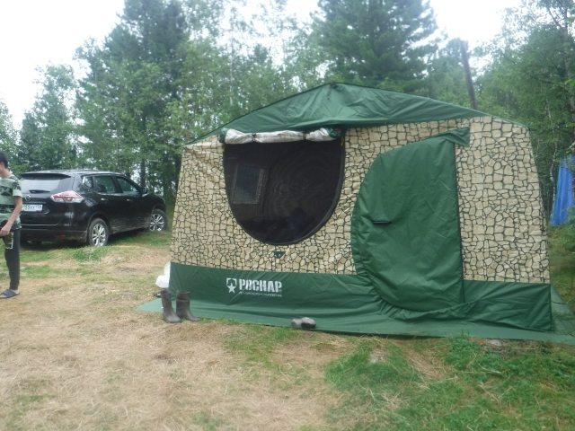 Вторая поездка в этом году была более основательной и с большим количеством людей. В Мурино много народу в августе, и мы смогли найти подходящую поляну для лагеря лишь в 2 км от заезда. В этот раз Байкал поразил чистой и тёплой водой. Никаких зелёных водорослей, спирохеты и спирогиры. Воду брали прямо с берега. Дно в ясную погоду просматривалось до 20 метров. А купаться можно было даже без бани - это редкость. Наш лагерь: В первый день нас было шестеро, и баню было решено сделать в Р-436. МегаСогра с этим легко и уже привычно справилась. Накупались до отрыжки. Пара небольших казусов. Во второй раз за 9 лет лопнул трос у полока в месте крепления, и трое сидящих на нём мягко грохнулись на тёплый пол Р-436. Привязали ветровой растяжкой трос и продолжили париться. Только больше двух уже не садились. Уже дома всё отремонтировал.