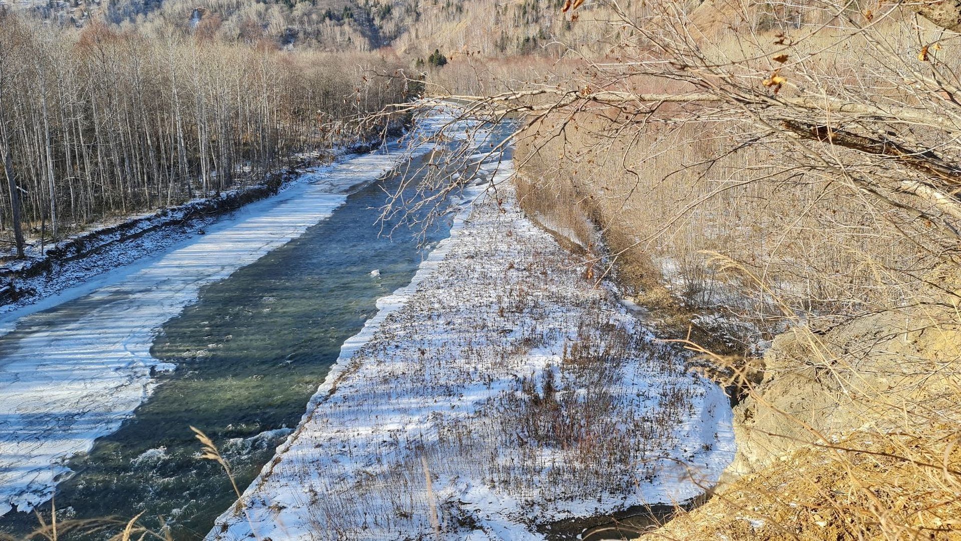 Вышли из лагеря около 10:30 утра, хотя в идеале нужно было выйти на пару часов пораньше. Чуть дольше собирались дома и местами гололёд на дороге не позволили приехать раньше. Первая половина пути была боле менее спокойная, хотя постоянные небольшие подъёмы и спуски не давали расслабиться. Шли в основном по охотничьим тропам, хоть я заранее и загрузил треки и обновил все карты, но треки оказались не совсем точные, а благо лежал небольшой снежок и был виден след охотника обходившего свои владения. Если бы шли полностью по треку, то времени ушло бы намного больше, все таки дорога постоянно петляла и порой не соответствовала треку. Со второй половины началось самое интересное, сначала затяжной спуск состоявший из четырёх частей, а затем свалились в ручей и около полутора километров шли вдоль этого ручья постоянно его перешагивая, перепрыгивая , продираясь сквозь кусты и прочее. Спускаясь вниз из головы не выходила мысль, как же мы будем подыматься по нему, но это все лирика.