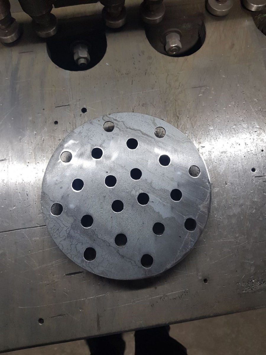 Диаметр 222. толщина 2.5 мм. Все опасаются что поведет. За пару лет не повело, а уж если , то просто молотком стукнуть.