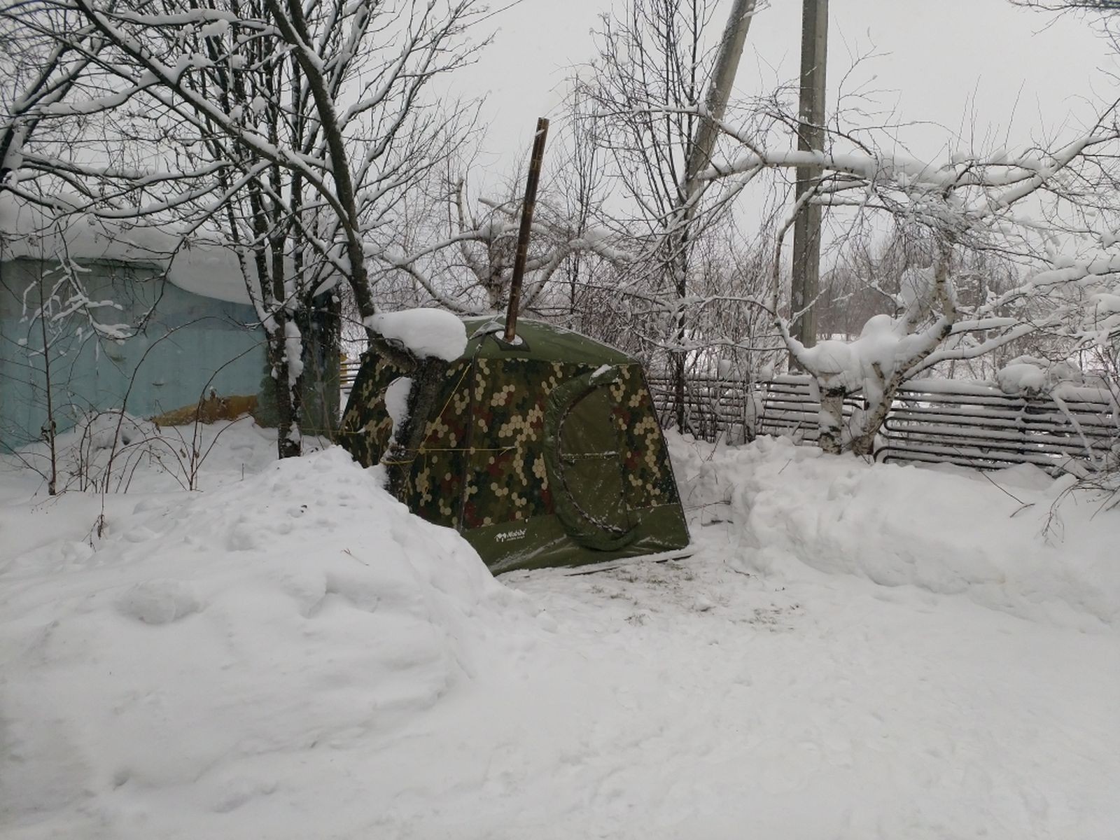 Самый геморр это конечно сворачивание баньки, как только дровишки прогорели, очень быстро палатка и тент замерзли, уложить их штатно не реально, пришлось скатать в комок и тащить домой на отогрев и просушку.
