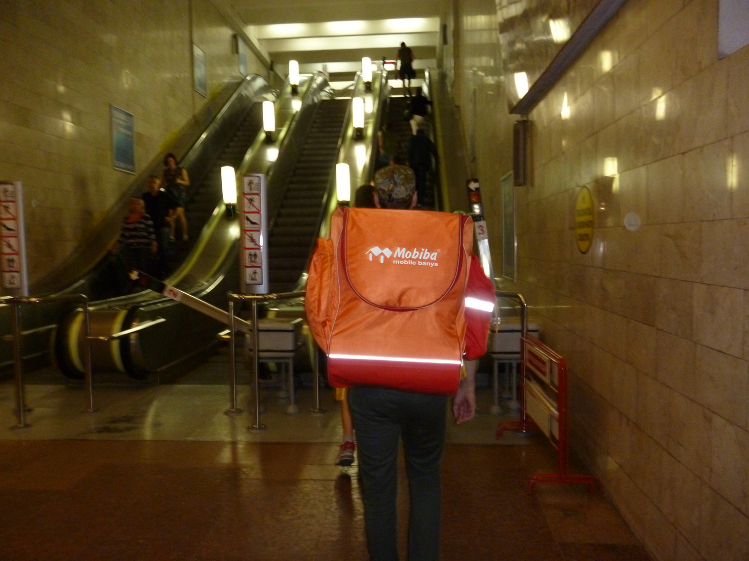 Итак, ровно в 10.00 утра (при еще ясной погоде) мы отправились прямо из центра левого берега по направлению к дачному поселку Мочище (пригород Новосибирска, правый берег р. Оби). Ранцевая баня была упакована в оранжевый ранец (первый пробник - праотец эксклюзивного ранца улучшенной модификации). Кстати, не такой усовершенствованный, как серийные ранцы, но не менее удобный и привлекающий всеобщее внимание.