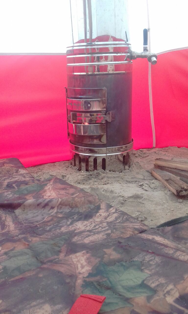 Благодаря подставке печь установили под нужным углом (напомню, сама палатка установлена под наклоном).
