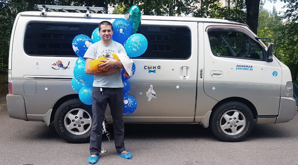 Ну теперь по надписи на машине всё понятно с полом новорождённого. Отец, трижды отец, Александр, поздравляю тебя с рождением сына. Так же поздравляю твою жену с рождением третьего ребёнка в семье. И представляю как Вы, после девочек, ждали сына.
