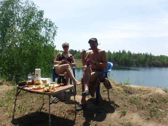 В 9 утра мы уже были на озере, занялся копчением пойманной накануне рыбы. Простенькую коптилку тупо ставлю на Шикардос. Коптить на Шикардосе очень удобно и экономично. Не надо искать кирпичи или камни под коптилку, а поддержание жара не требует никаких лишних телодвижений, как если бы это было без Шикардоса. Нас сегодня двое, поэтому три рыбины до обеда нам хватило. После обеда пожарили сочную свиную шейку. Баня с купанием в озере тоже была, но снимать уже было некому.