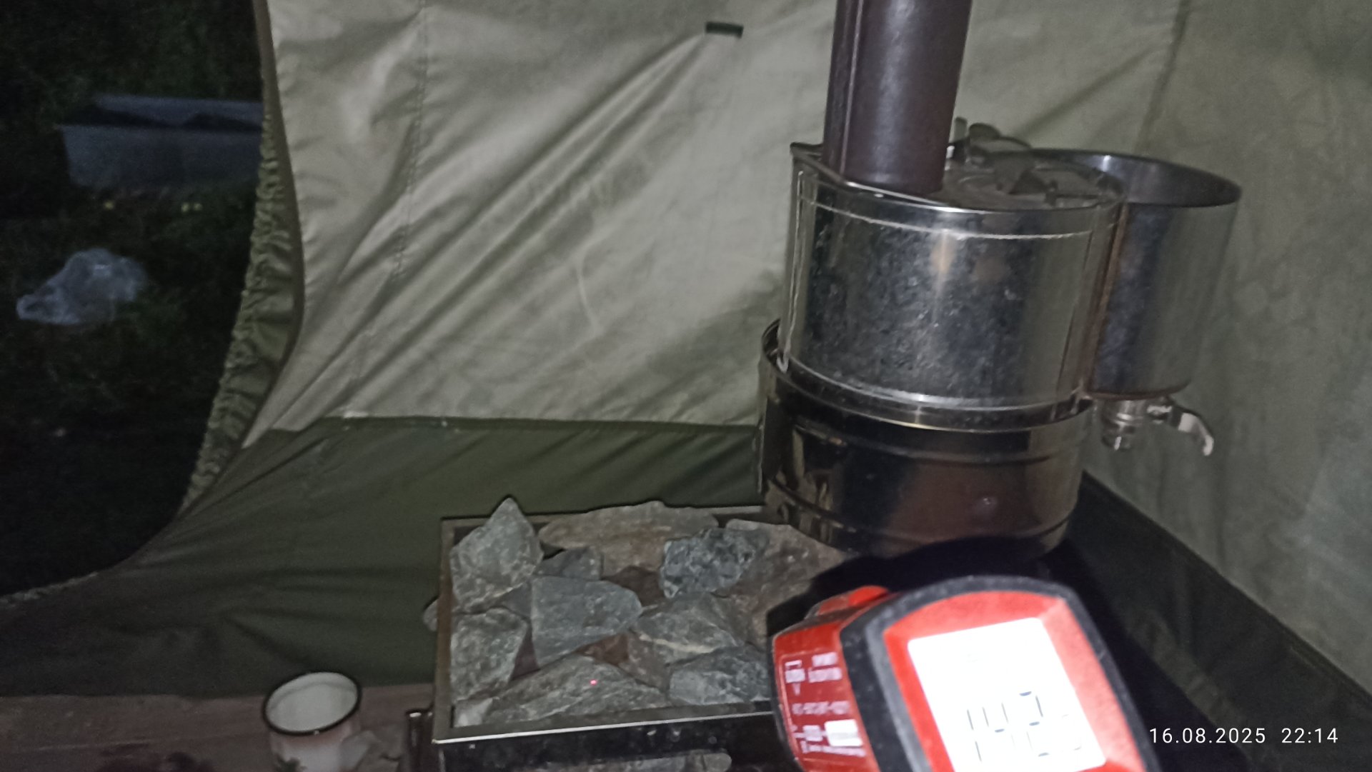 Очередная баня. Решил сделать замеры температуры и посмотреть как нагревается каркас и сама палатка. Первые замеры делал неделю назад,9 августа. Баня была уже поздно,целый день был дождь, приехали к вечеру и затопил ближе к 22 часам.