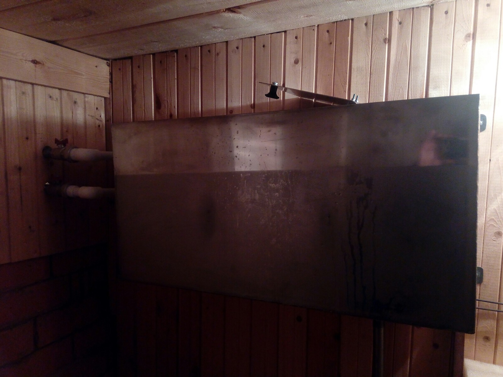 Размеры примерно 4х4,5 м. С пристройкой-тамбуром-дровником. Блин, вот теперь точно померю, самому интересно стало. Большой (в масштабе бани) предбанник-раздевалка, и небольшие (после МБ-15) парная и помывочная. Солистом всего этого недоразумения была, впрочем почему была, есть печь. Большая, железная, сварная, и это не первая ее жизнь, в некоторых местах по нескольку слоев не тонкого металла. С самого начала меня невзлюбила, впрочем обоюдно. Самый главный ее минус - крышка водогрейного бака в предбаннике. Вот так происходит когда вода закипает. Вот так печь выглядела из парной. Полок, из осины, как и вагонка, под вагонкой все обито алюминиевой фольгой (клише из газетной типографии). Вылизали дерево, вычистили каменку, вынимая слоями отходившую ржавчину. С помощью гвоздодера, молотка и какой-то матери вытащил заслонку. Кучу времени убил на попытку очистить от ржавчины и довести до приемлимого состояния бак для воды. В первый раз мылись желтоватой водой, которая за несколько минут до точки кипения резко мутнела и меняла цвет на оранжевый, а после прекращения активного кипения становилась попрозрачней, и хлопья ржавчины водили в ней хороводы.