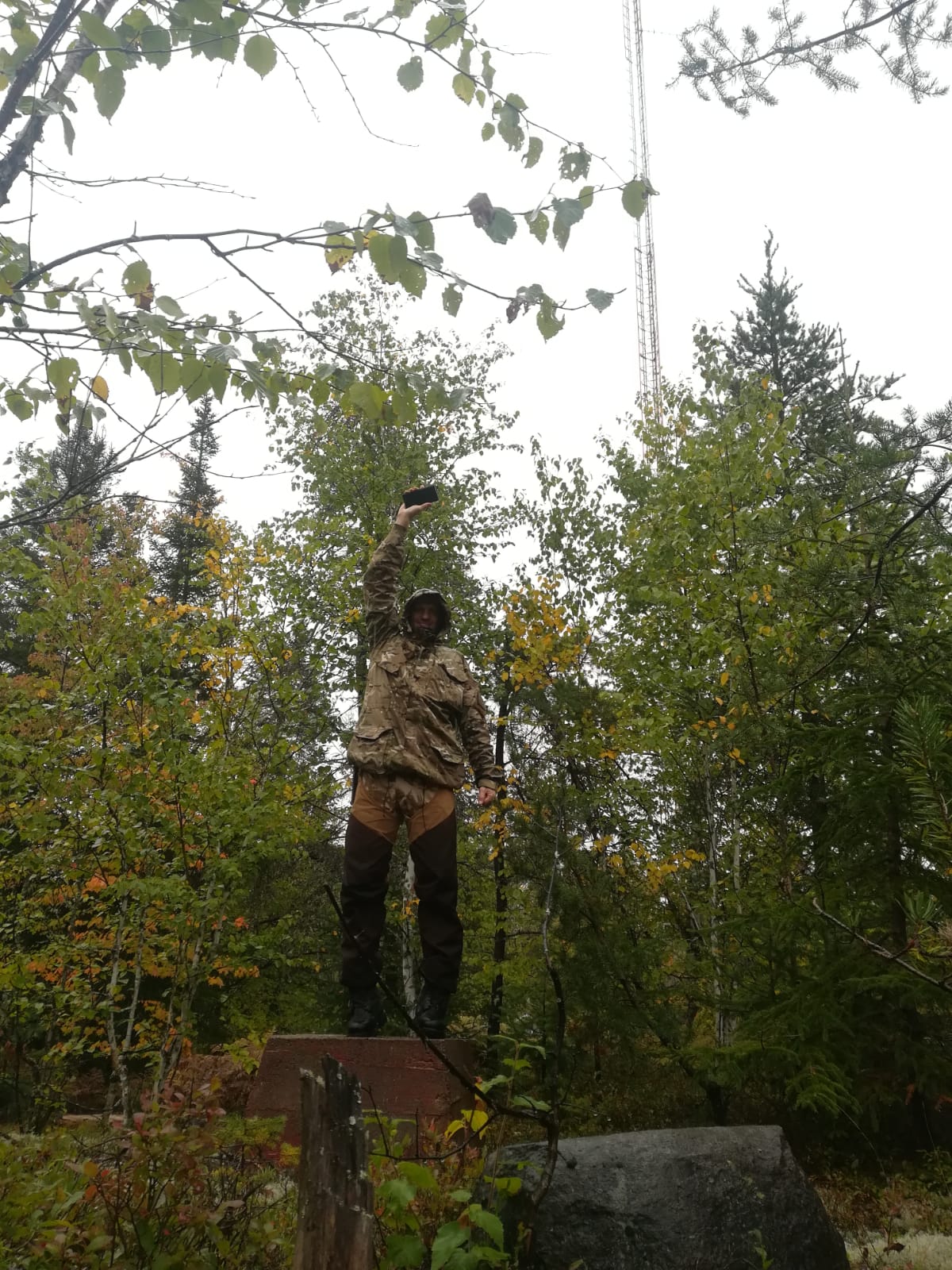 Место было для нас новое, неизведанное. Да и погода как-то сразу прижала дождем, ветром и сырыми дровами. Ходили в гортексе почти постоянно. Мой товарищ, у которого "на перевале дождь и у радиста мат идет от сердца", по образованию связист. И он в какой-то момент затащил нас на горку, на которой стояла высокая антенная вышка радиосвязи, в надежде поймать сигнал сотовой связи, который пропал уже 40км как. И таки поймал своим Хуавеем. А мне с Samsung Note пришлось лезть на бетонный постамент и стоять там с вытянутой рукой, чтобы сообщения проходили