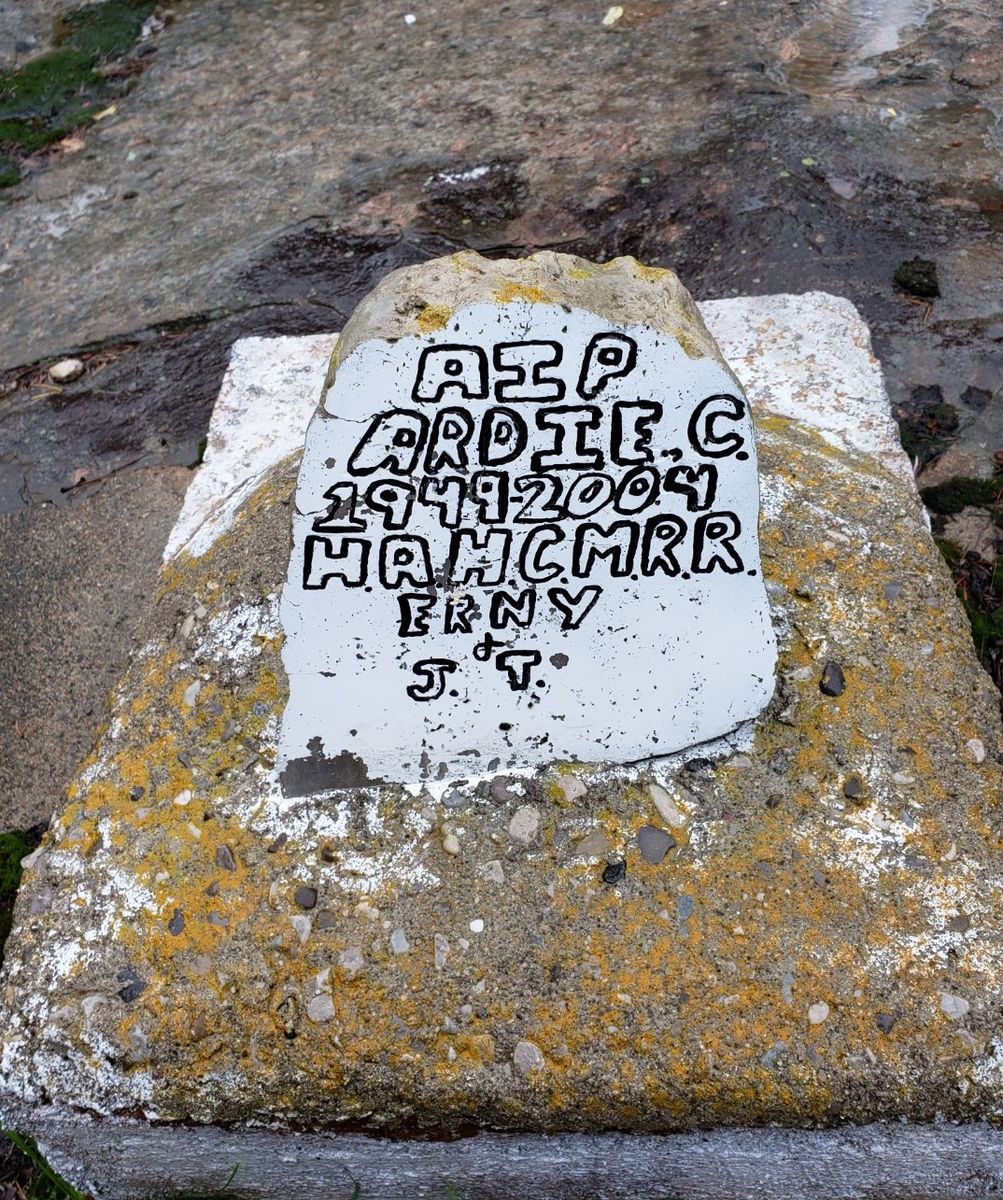 На одном таком бетонном посстаменте-опоре я обнаружил странную надпись. Вчитался и понял, что там, видимо, чей-то прах. Какой-то местный житель по имени Ardie C. умер в 55 лет, его приятели его прах сожгли (вот совсем не думаю, что кремировали через фирму, дорого это, да и нет там такого), выдолбили в опоре ямку, высыпали и забетонировали. И написали некое сокращение какого-то стандартного пожелания, расшифровать которое я не смог. Сперва идет RIP - Rest In Peace - Покойся с миром, а вот что потом, не знает даже Гугл...