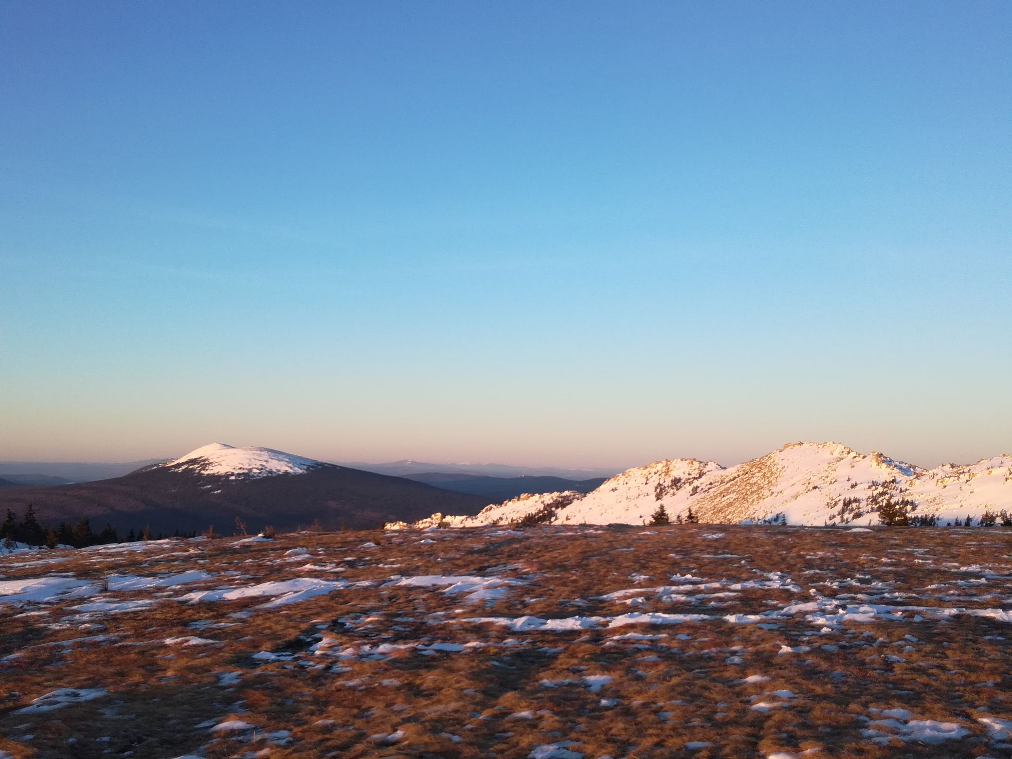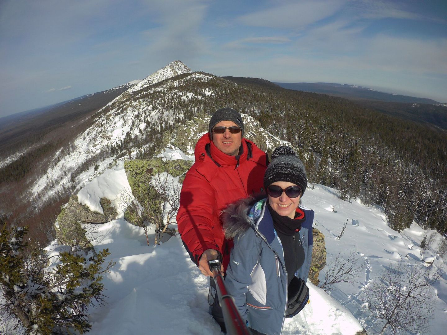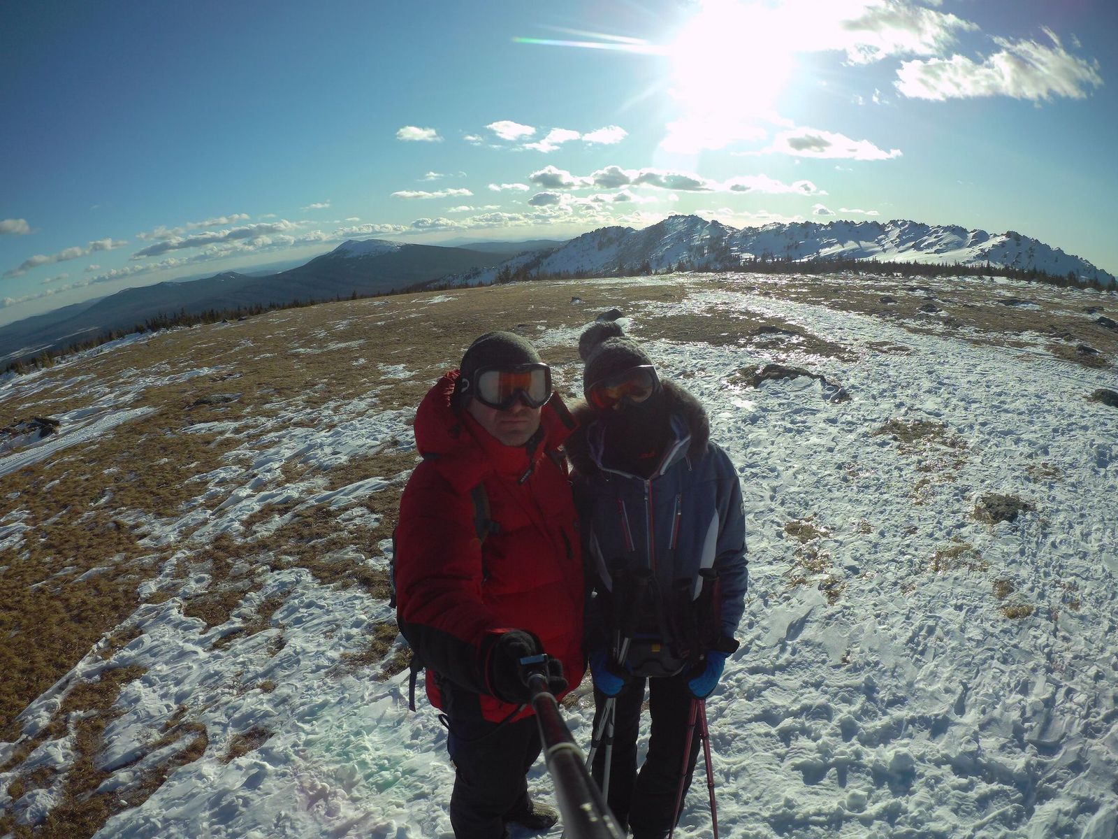 Оставив рюкзаки под елочкой, забрались на край "Откликного гребня", до куда была протоптана тропа. Из-за гребня дул холодный ветер и мы по быстрому осмотрев окрестности сфотографировались на фоне горы "Круглица". Наш путь шел к ней и она была все ближе.