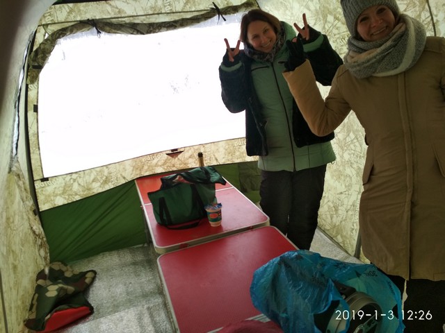 Для этой поездки специально покупал печь «Согра-3», и сегодня ее протестируем в комнате отдыха. Андрей Николаевич (Иванов) мне предлагал вместе с Согрой взять еще утепленный пол для палатки, но на тот момент финансов не хватало. Жена говорит, что УП мне на день рождения подарит. Поэтому обошлись пенофолом. Согра занялась своим любимым делом – пожиранием дров, и очень быстро в палатке была комнатная температура. Наши снегурочки (или русалочки) стали накрывать на стол, а мужская половина – установкой Кайфандры с печью КЦ-3, копчением рыбы и созданием проруби (всю рыбу рыбакам спугнули). Хотя, рыбаков спугнули не мы, а поднявшийся сильный ветер и метель. Вот такой вид открывался рыбакам на наш лагерь. Тем временем, девчата накрыли на стол и позвали нас в палатку. Время летело быстро, а зимой темнеет еще быстрее. До проруби дело дошло только когда уже стемнело. Естественно, всем уже было не до фото. Рыбаки еще до темноты все уехали. Тем более, поднялась сильная метель. Пока дойдешь до проруби, тебя всего засыплет снегом. Залезешь в воду по самую шею и вылезать не хочется – в воде теплее. Вот уже и собираться пора. Позвонили водителю Нивы, чтобы приезжал за прицепом. Сами потихоньку начали все складывать в прицеп. Работа по сворачиванию лагеря была дружной и слаженной. Единственное, что мешало – это сильная метель. Из-за нее потерялся один шлепанец. Значит мы сюда еще вернемся. У всех была масса впечатлений от этого дня. Особенно отметили работу печи «Согра-3».
