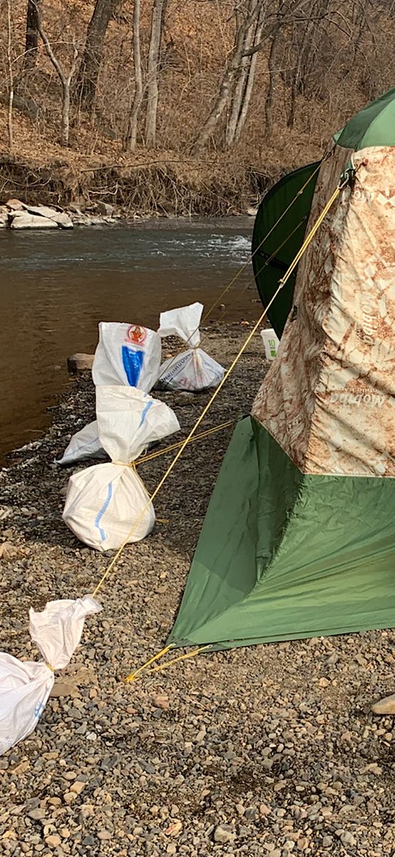 На другой конец растяжки я карабин ставить не стал потому, что использую и колья и мешки с камнями. В случае с кольями ( они у меня металические с кольцом) я карабин пристегиваю к кольцу кола а второй конец веревки на узел к бане, если же мешки с камнями то наоборот, карабин за баню а свободным концом привязываю мешок!