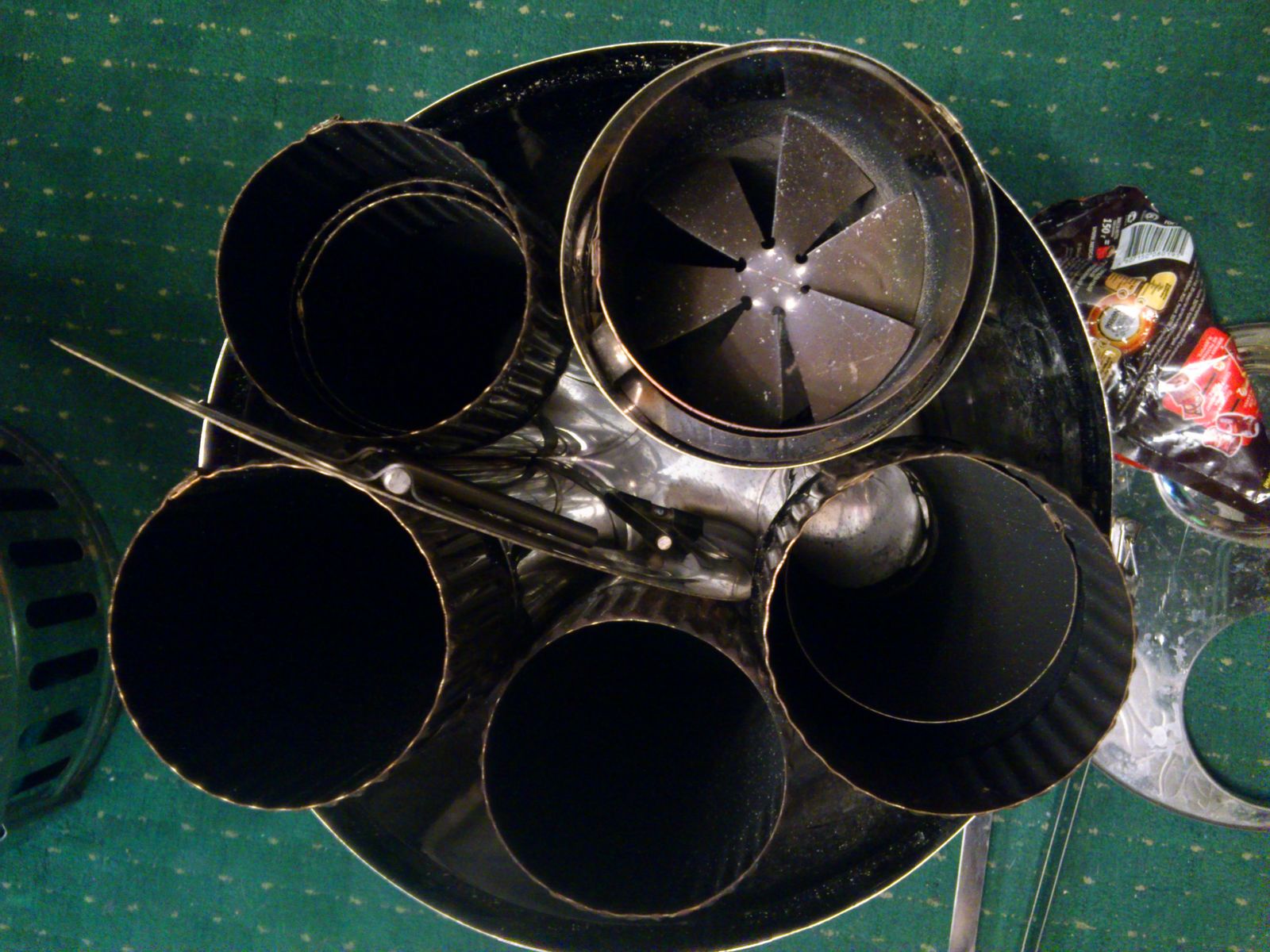 Самое ценное из изменений по моему мнению - пластина перенаправляющая движение пламени в топке. Прошу не пинать за грубоватое исполнение, точечную сварку пока не закончил, а электродом нержа толщиной 0,5мм сложно варится. При транспортировке она укладывается между топкой и отражателем. При установке в топку, она ставиться с наклоном из-за разной длинны тяг как у каминного зуба, чтоб пламя двигалось в сторону дверки