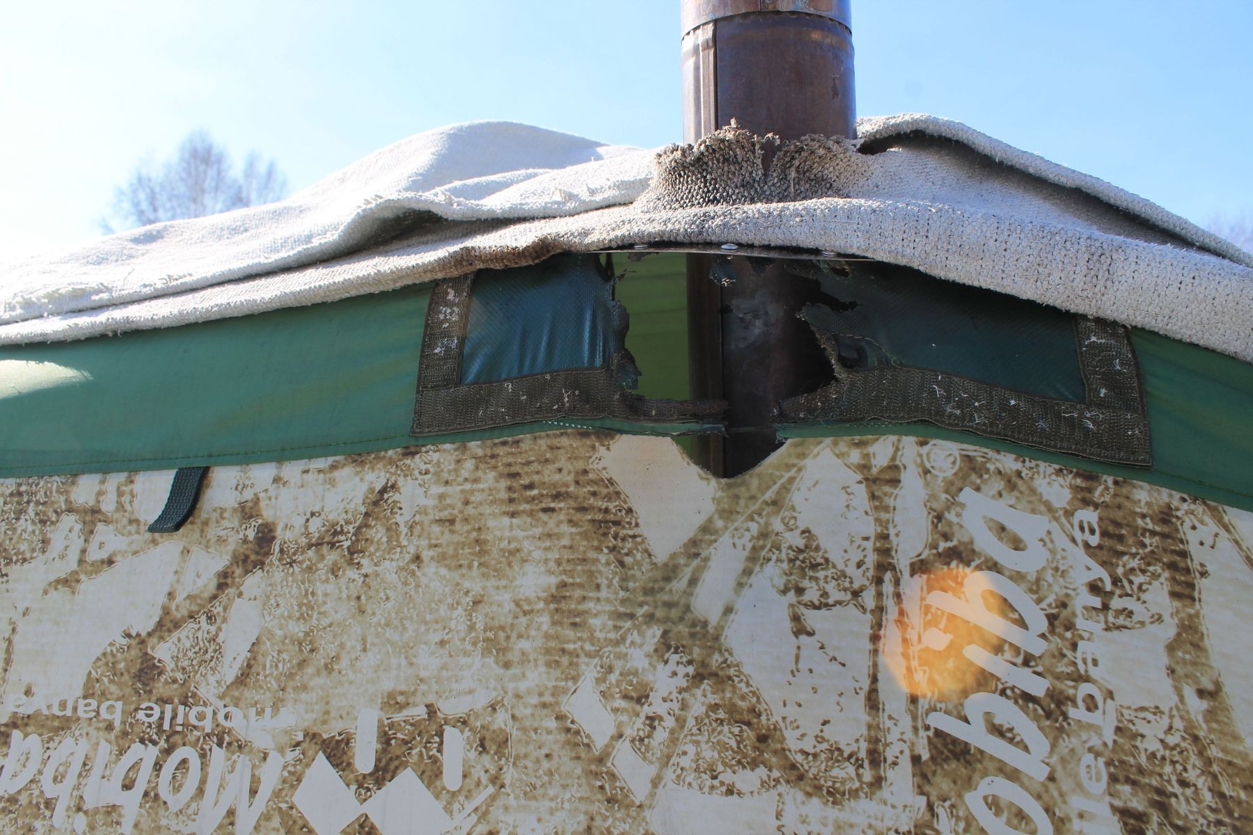 Юра, я сам в недоумении. В этот раз даже не сталеварил, заслонку почти не выдвигал, в топке максимум 4 брикета, на палатке все положенные растяжки натянуты, разделка на трубе расклинена. Заметил случайно, минут через 15 после первого закипания воды, даже и не глядел в ту сторону, просто в голову не могло такое придти, больше следил, чтобы угольки на ПУ не падали.
