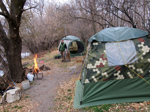 Здравствуйте, как там говорится, после дождичка в четверг и несмотря на то, что по прогнозу передавали дождь, в пятницу рано утром мы вырвались на «своё» место. И не ошиблись, дождя не было, а с субботы погода просто радовала: по ночам небольшой минус (вода в вёдрах покрывалась корочкой, которую трудно было пробить), а машинный термометр показывал минус один, два. По утрам туман был такой густой, что солнышко пробивалось только к девяти часам, с деревьев начинала капать изморозь и наступала благодать. В большинстве был полный штиль, только иногда порывы начинали гнать рябь по воде. Термометр показывал + восемь – десять, но по ощущениям было очень комфортно, ходил в одном килте. Из Мобибабария взяли МБ-15 без внутреннего тента и утеплённого пола, в результате Согрочку приходилось кормить через 4-5 часов. Парились с Паробомбой. Хотя она и большая, но связка Медиана + Бак для воды + ведро с камнями, мне кажется, занимают больше места, а в этот раз его катастрофически не хватало. Брали и Кайфандрюльку с Жигой и сделанными под неё полками, чтобы не разбирать спальное место, но тут затрудняюсь сказать, что лучше. Паробомба на улице не просто стояла, а использовали как источник горячей воды, очень удобно. Дон по рыбке в этот раз что-то пожадничал, один раз сварили уху и домой ещё на одну, ну и ладно, в этом сезоне мы рыбой наеденные. А как быстро стало темнеть по вечерам. Первого начали собираться вроде с запасом, а последние вещи уже в полумраке грузили, да ещё и не влезают. Сюда приехали, было на «продукты» больше, а назад сплошной тетрис, но всё равно, остались очень довольны.