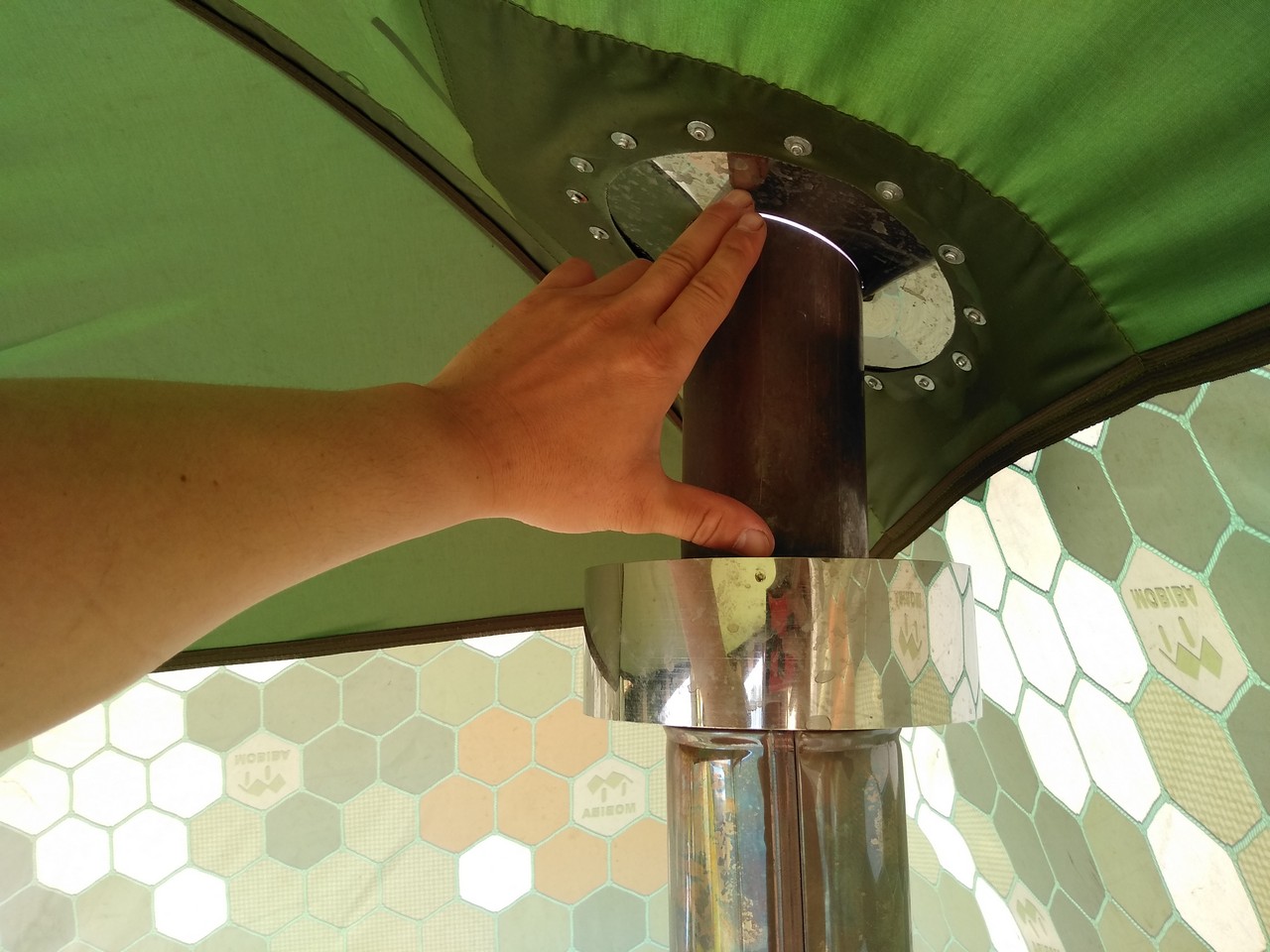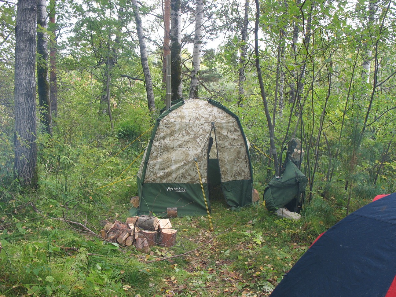 Любо дорого посмотреть не торцы дуг, они имеют заглушки с фирмовой символикой. Мелочь а приятно )))) Кстати материал дуг не пачкает как раньше руки алюминием. Ну Вы знаете - когда берете в руки алюминиевую проволоку она чернит пальцы рук. ТАк вот они анодированные и уже выглядят очень презентабельно и практично. В сумке от мобильной бани помещается кстати не только сама МБ-10 но и кружка, черпак и ППГ Собрал МБ-10 акв, привычно быстро и легко, несмотря на ветерок. Установил КЦ-2 эксклюзивную уже можно сказать печь. В тандеме с ППГ она выдает именно то что надо, мне очень понраву те кондиции которые она выдает летом. Как раз то что надо. Печь абсолютно всеядна, по пути к водоему приволок с лесу обычную падалицу - сушины которые были повалены ветром. Погибшие от весеннего пала деревья. напилил бензопилой и наколол в поленницу.