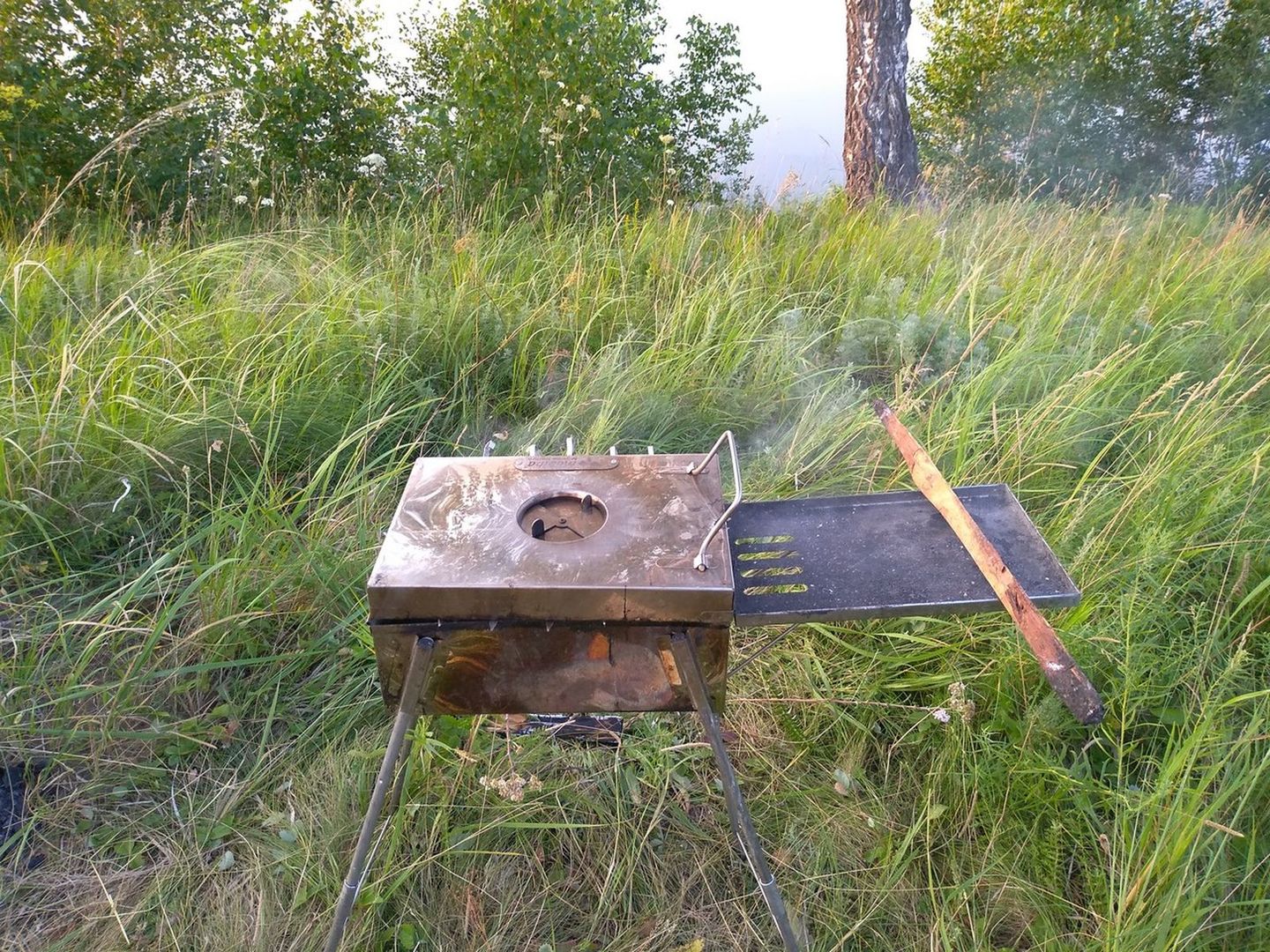 При установке КЦ-2 и ППГ у меня кстати вот так до разделки. и вот так от стенки шатра МБ-10 акв. уложил каменку и забил дровами под завязку Замочил шикарные венички подаренные Андреем Соколовым из Питера и понеслось )))) Шикарно, рай на земле существует! )))))) Трубу печи, кстати, специально заваливаю в бок за неимением колена на 45 градусов, и искрогасителя модели Сергей Потапов по пути ветра. На данный момент ни одного прожега ни на крыше - ни юбке МБ-10 кстати после того как убрал баню и разобрал печь КЦ-2 ,специально поглядел на состояние травы под печью. Специально не вырывал, не обкапывал и не проливал водой в процессе эксплуатации. Печь кочегарил два дня, так вот ни гари, не дыма, не горелого запаха я не ощущал. Вот так выглядит уже бывшая сухой, до установки печи, трава под печью. После баньки как всегда уже фирменное блюдо, приготовленное благодаря наличию мангала гриля Шикардос. ))))) Жаренная картошечка по рецепту (лично для меня он его открыл!)) Ильи Глухова с Ярославля.