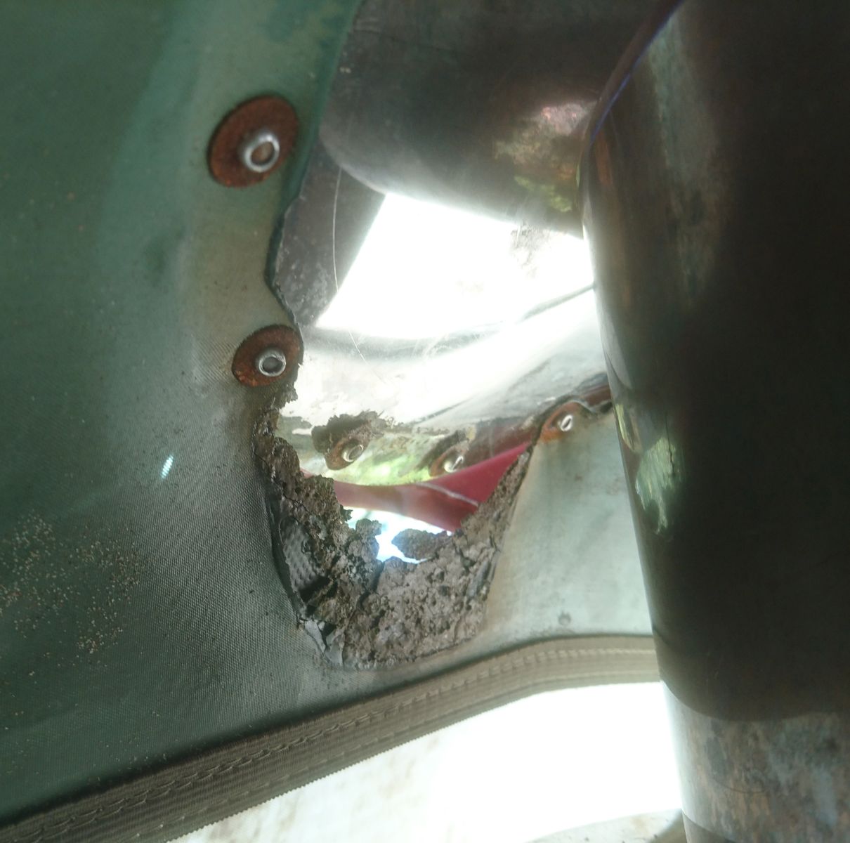 Сам не знаю, как так получилось, видимо, плохо оттянул палатку от ППГ-90. Дырка не критичная (пока лето по-крайней мере), но хотелось бы заделать, чтобы дальше не пошло (хотя несколько выездов прошли без роста дырки)