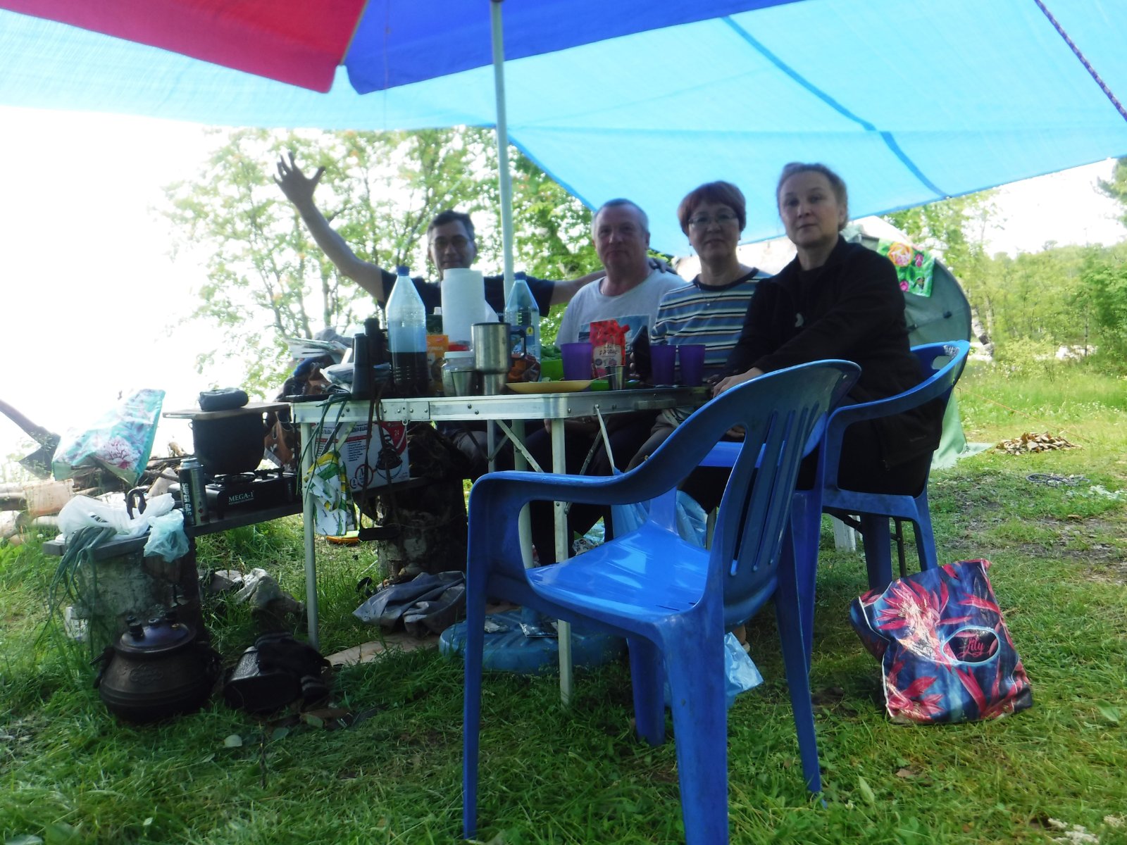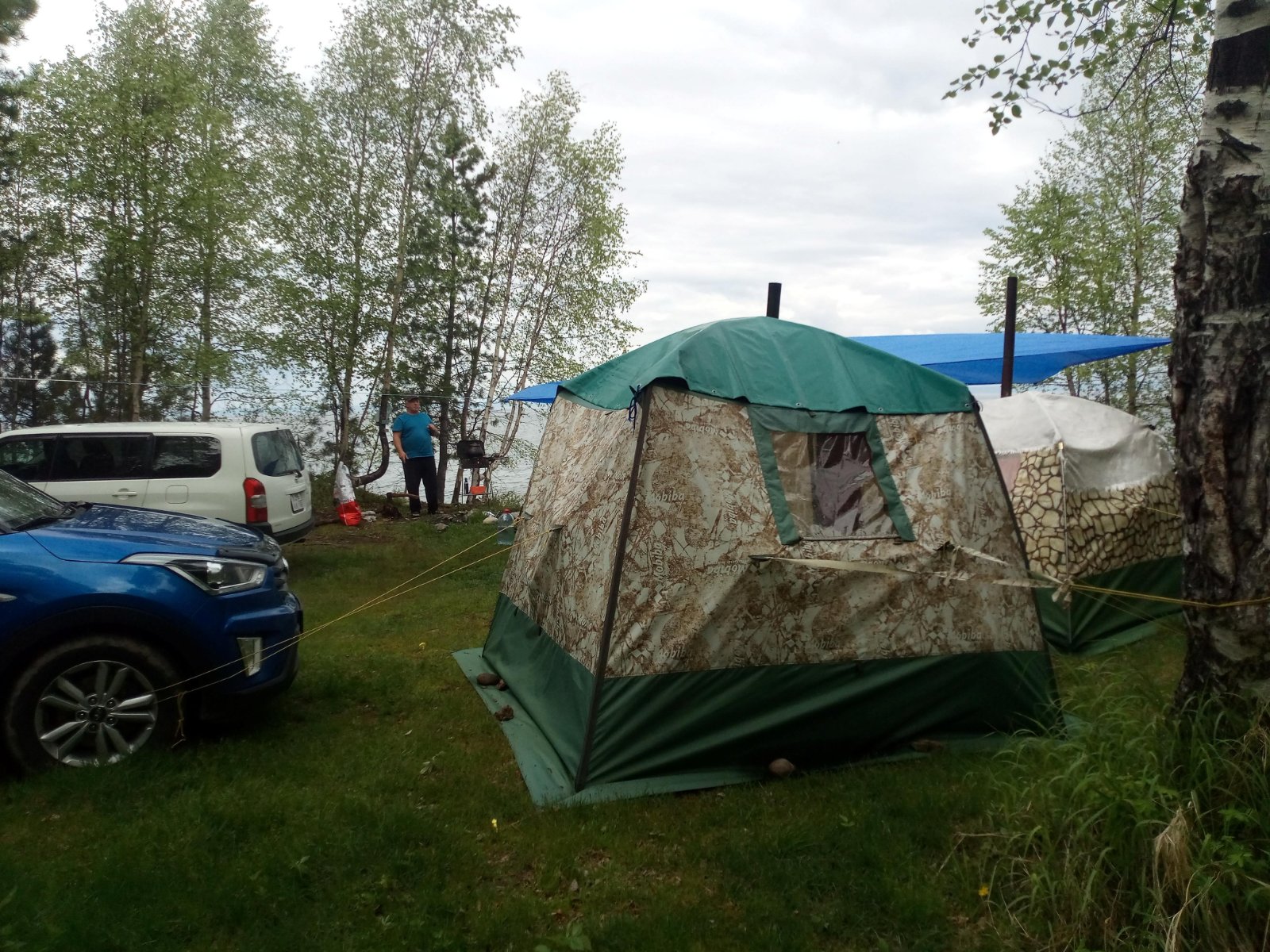 Итак, мы вчетвером в прошлогоднем составе. Народу в Мурино, на удивление, немного. Выбрали для лагеря небольшую тупиковую поляну в кедраче и довольно густых зарослях, но при этом на самом берегу. Обработали саму поляну, одежду, машины и палатки от клеща. По приезду было солнечно, тепло и относительно безветрено. Даже САПы плавали Байкал в этот раз относительно чистый. Воду для кипячения брали прямо с берега, за питьевой уходили на лодке метров на 200. Однако, Байкал на то и Байкал, чтобы менять погоду по 20 раз за день, причём очень резко. Сначала налетел штормовой ветер. Синий китайский тент оторвался с десяти растяжек, перевернул зонт и стол со всем содержимым. Мобибы стояли, как памятники. Потом, как из душа хлынул ледяной ливень. Баню в первый день топить не планировали, но пришлось.