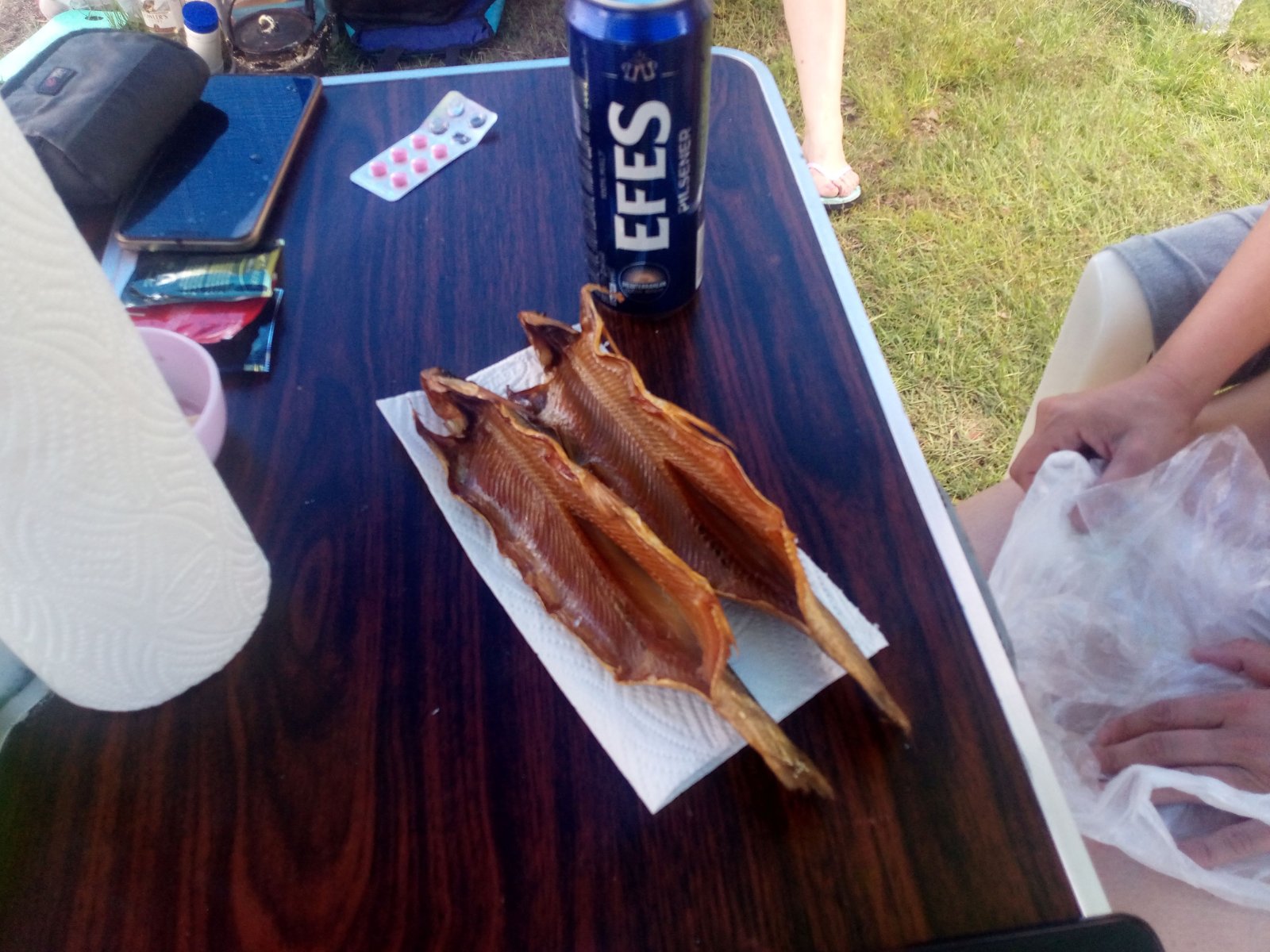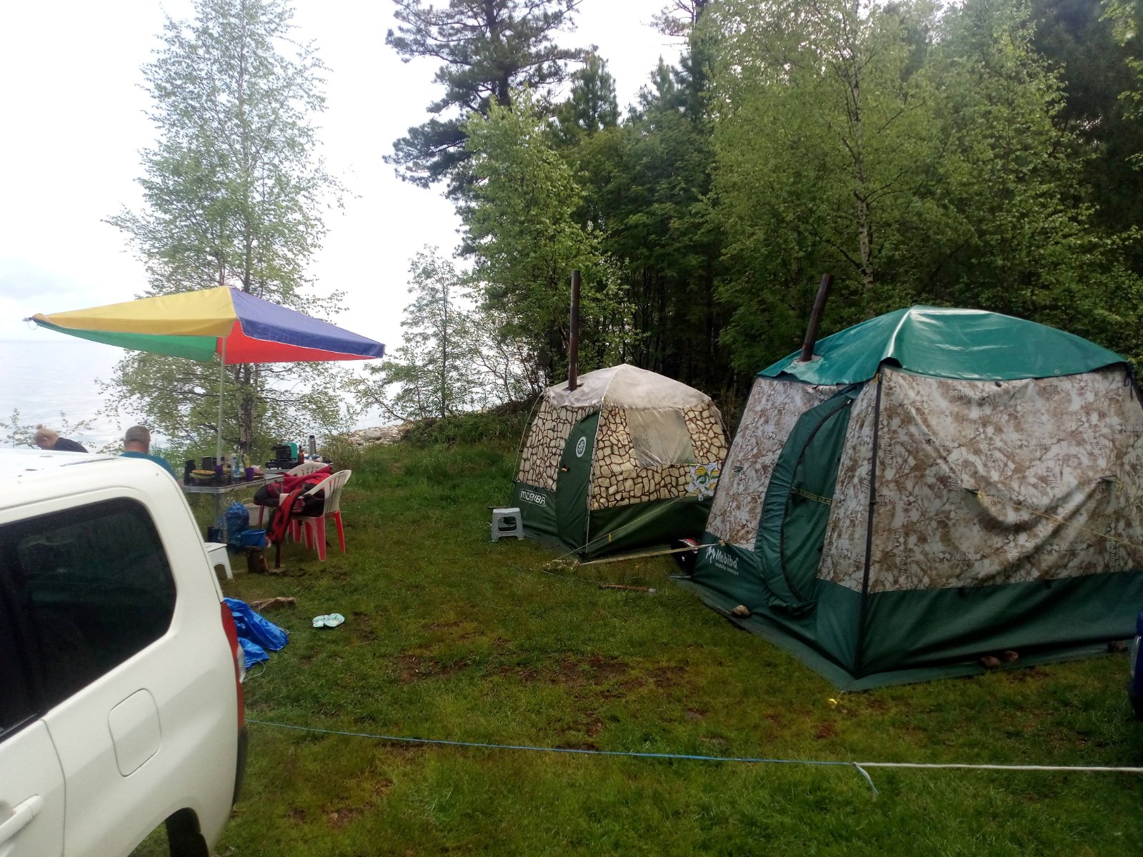 Ветер стих так же внезапно, как и начался, но дождь шёл 6 часов. У каркасного зонта отломилась одна нога. Сделали ему шину. Вставили ветку, замотали изолентой и водрузили на место. Я не большой любитель байкальского омуля (ленок с Белой получше будет), но отдаём дань традиции. Крета друзей не приспособлена для ночлега, но им ещё в прошлом году понравилось спать на надувастиках в Пробоксе, поэтому третью палатку я не брал. Мы же классно расположились вдвоём в пятнашке.