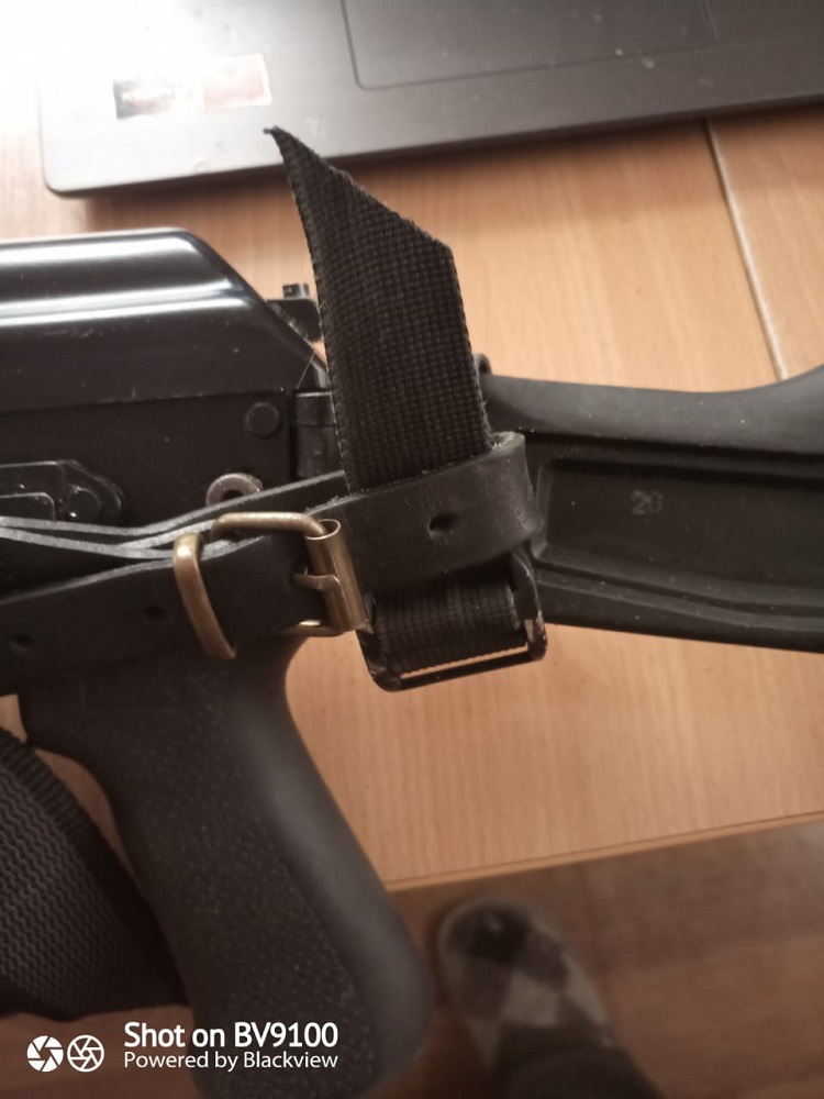 Кстати, такой способ ношения оружия вполне сочетается с рюкзаком. Но как всего этого добиться на «гибридной» «Сайге» с охотничьим цевьем и автоматным прикладом? Достаточно просто. Сначала переносим антабку со штатного места в нижней части цевья на его левую сторону, по аналогии с автоматным. Микрохирургичненько (если крепить не к пластику цевья), но оно того стОит. Затем берем авизентовую тесьму (сантиметров примерно 30, возможно – чуть больше) с двухщелевой пряжкой и оплетаем ей шейку приклада так, как это показано на фото. Заодно фиксируем тесьмой штатную антабку, расположенную с правой стороны приклада. Затем продеваем в получившуюся конструкцию ремень. В случае с ремнем возможны варианты (какой именно выбрать), но я предпочитаю такой, как на фото. Почему именно такой? Потому, что, во-первых, он с силиконовым покрытием, а значит, не скользит по одежде и снаряжению при переноске. Во-вторых, потому, что вместо привычных для армейских оружейных ремней карабинов, он снабжен кожаными ремешками, что исключает лишнее «блямканье» снаряжения, столь характерное для армейского оружия и столь неуместное для оружия охотничьего.