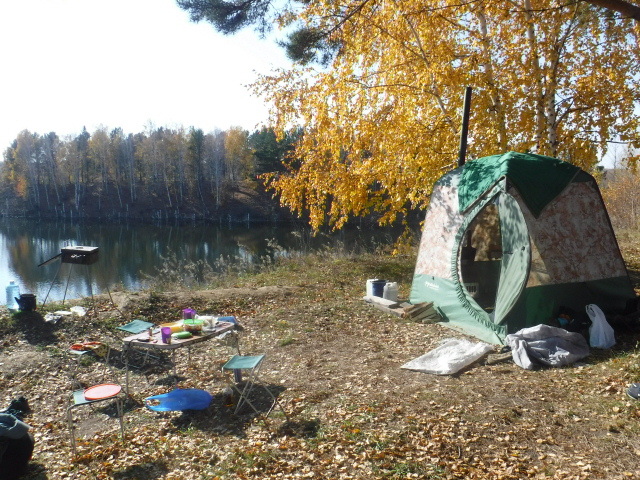 Золотая осень закончилась, на носу Покров. Очередная вылазка на реку с Мобибой. Поехали вдвоём, поэтому ограничились десяткой. Согра что-то у меня в этом году разошлась и даже в октябре сделала нам баню. На момент парения на улице было +4..+7, в парилке под потолком 80..85 градусов. Десятку укрывал стёганым ватним одеялом, а пол застелил квадратами-пенкой, ну и камень жадеит повышает банные кондиции. Дрова - сухая смолистая сосна. Труба наклонена, т.к. Согра стоит вплотную к стене палатки.