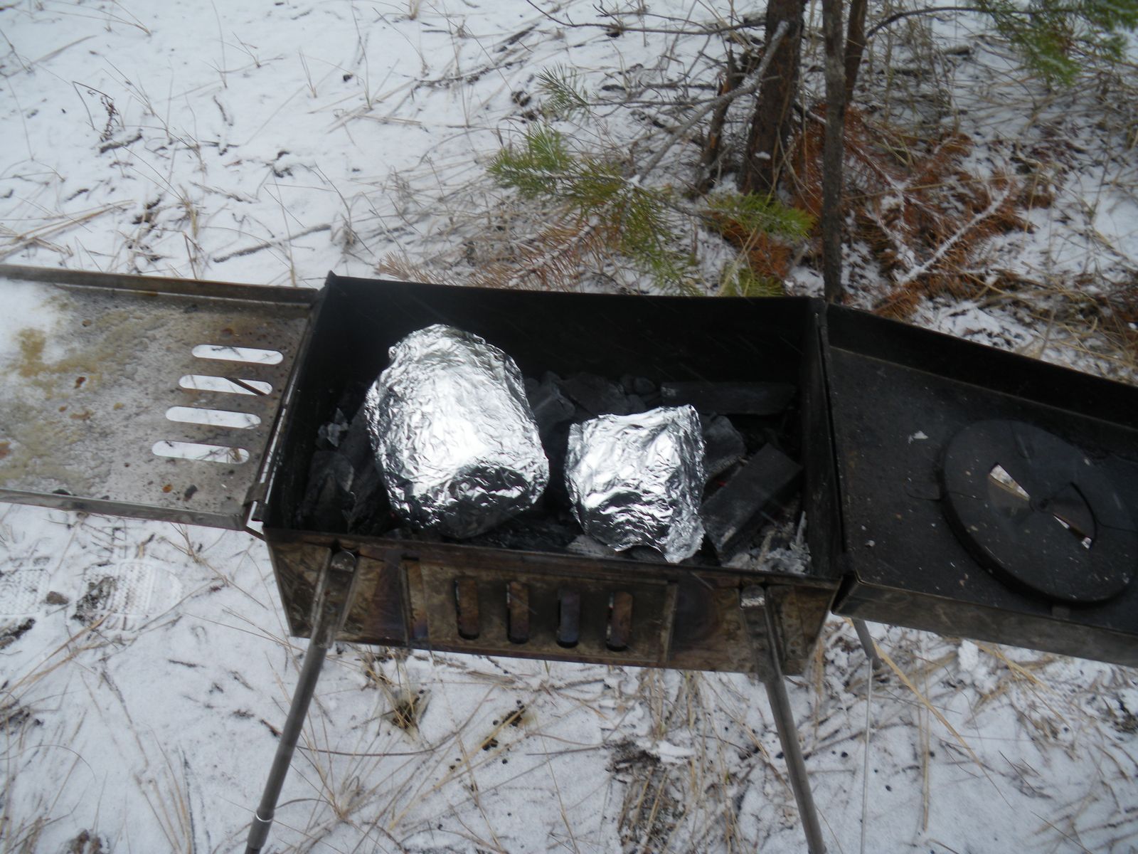Вот теперь можно и позавтракать нормально! Не ИРП или шулюмом надоевшим, а действительно нормально. Горячо, остро и вкусно. Как? А очень просто. Разжечь «Шикардос» и положить в него заранее приготовленные и замаринованные Мариной Маленькой свиные рулеты из пашины. Ну и что, что решетки для мангала мы забыли на Суслово? Можно подумать, что в моей продуктовой сумке фольги нет!