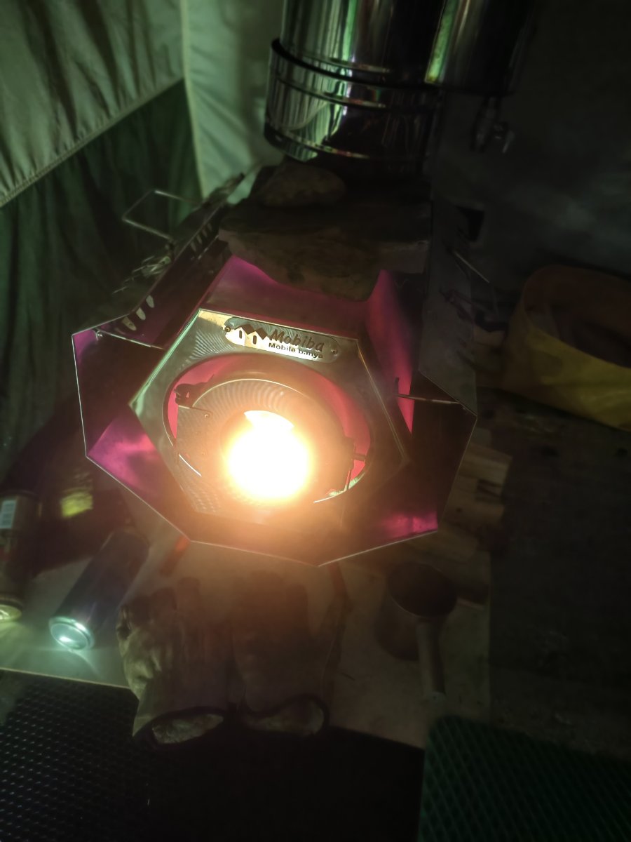 Ночь была непростой. Печь Согра при +9-12 градусах явно большевата для такой палатки как МБ-15, даже в режиме длительного горения. Жарко.
