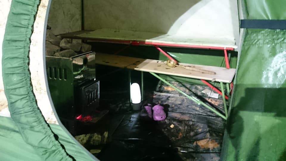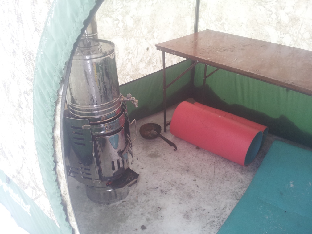 Второй отапливаемой палатки зимой очень не хватает. Мы для отдыха выхолаживали баню и наливали в бак КЦ-3 свежей воды, чтобы не парила.