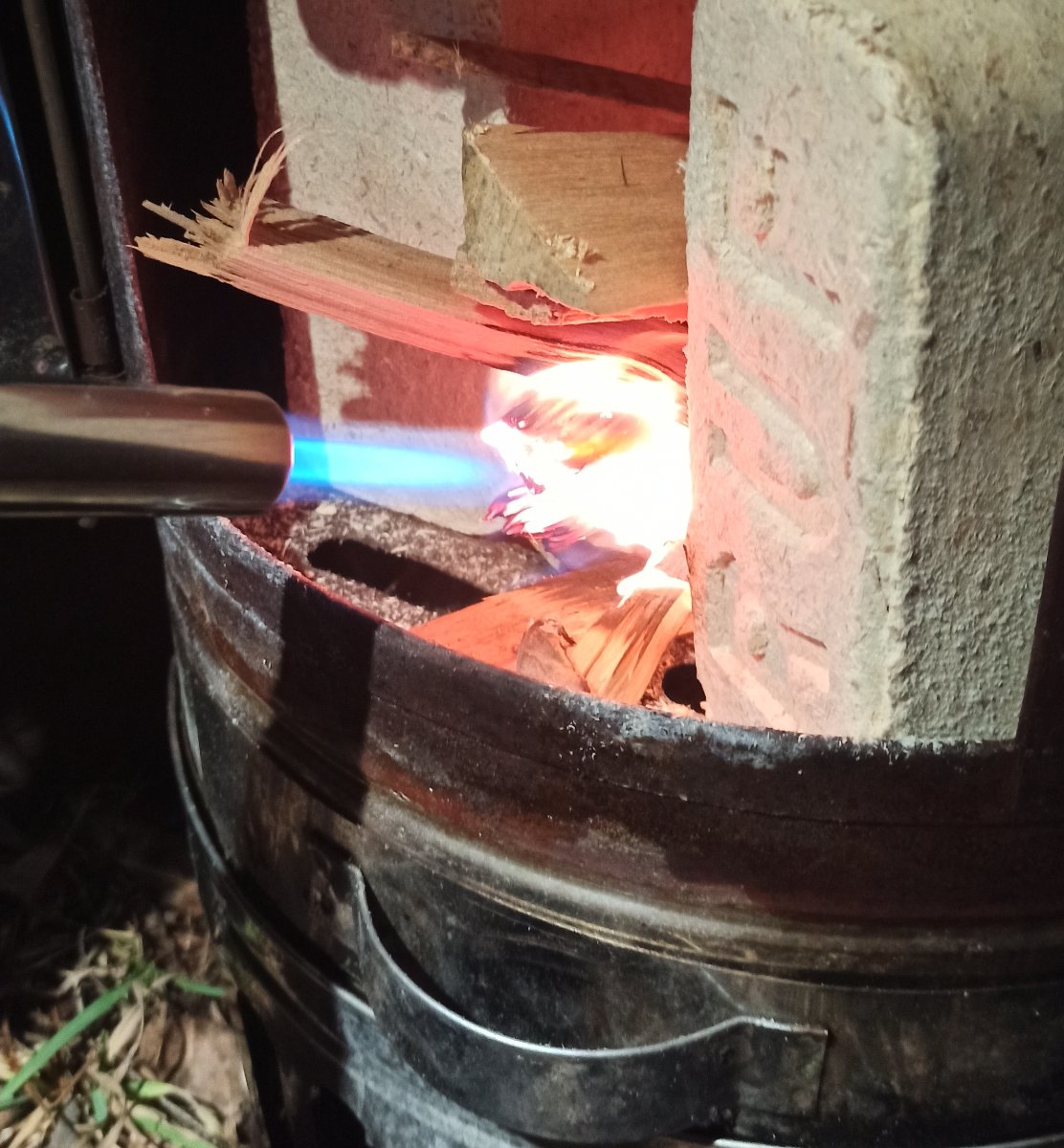 Есть ещё один простой способ,не раз писал уже,едешь из дома на машине,налей 10 литров горячей воды в канистру,от ноля градусов такой способ практикую. Если воду набираешь на месте,коли брикеты и дрова для первой протопки помельче и не забивай сразу топку целиком.