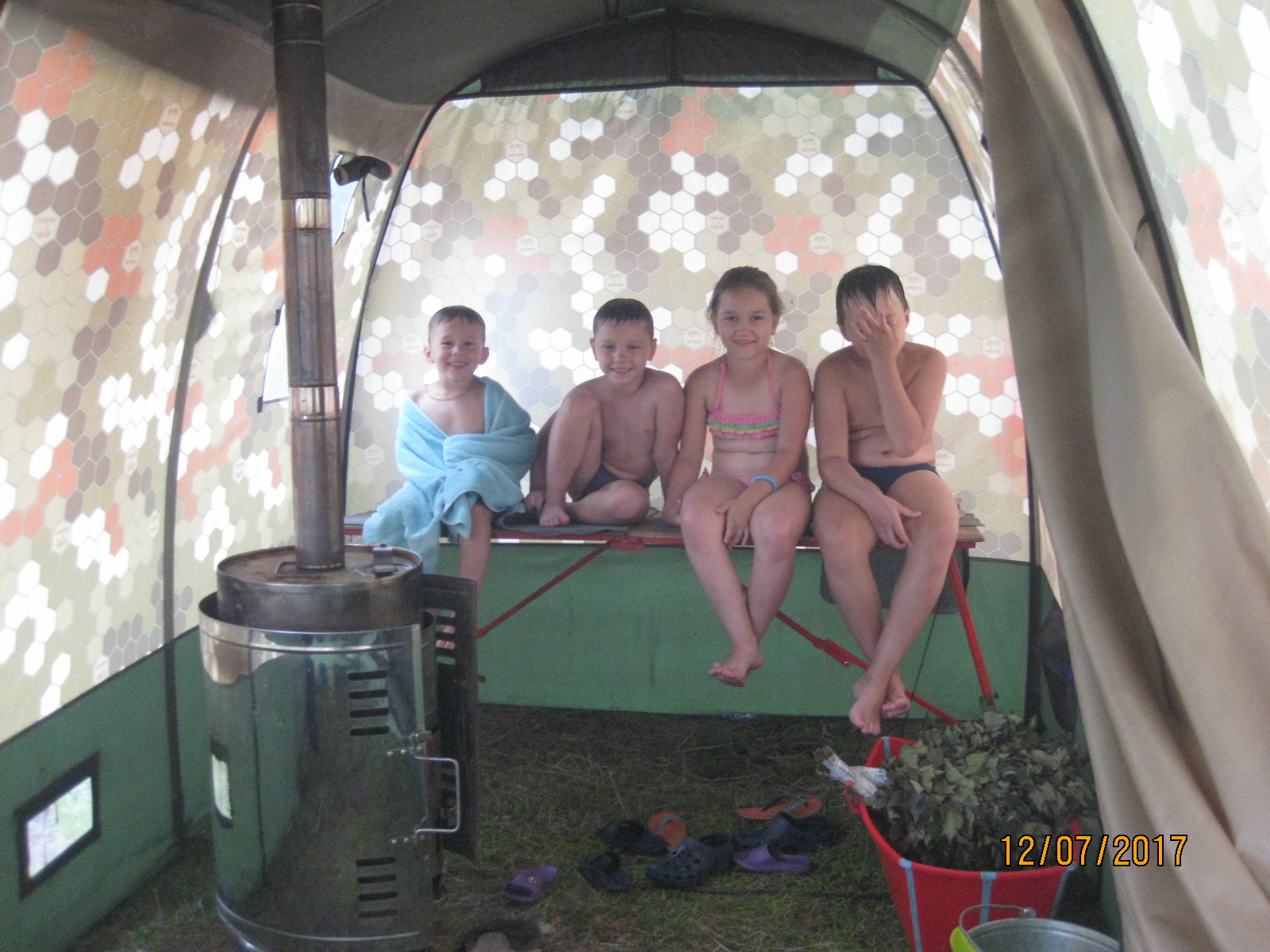 Выкладываю отчет с очередной поездки с Мобибой. Ездили на Белую двумя семьями с младшими детьми. Баня топилась вечером, когда спала жара. Ночевали вшестером в МБ-104.