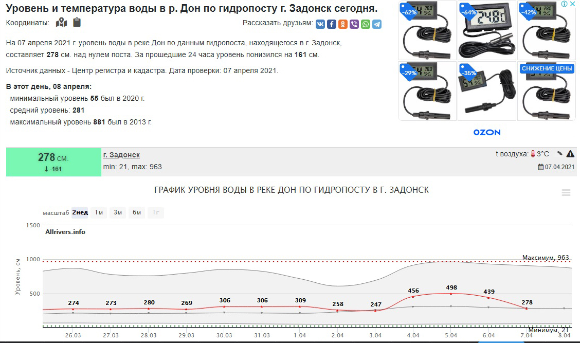 Максимальный подъем воды в реке Дон в Нововоронеже примерно 1,3 метра до весеннего уровня + 4,6 м. наблюдался 07 апреля.
