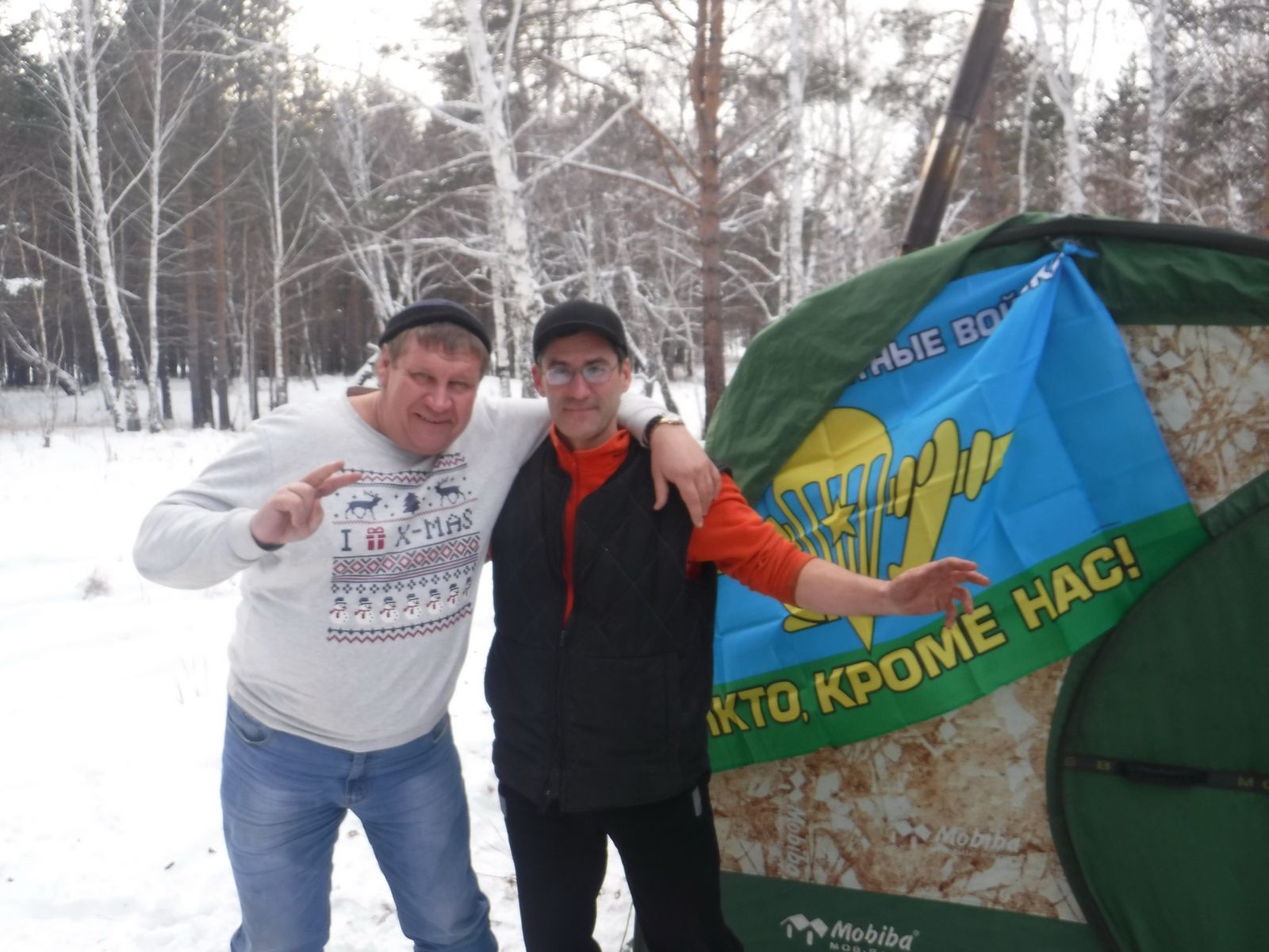 Но надо ещё мужиков собрать, тех друзей, с которыми я 25-30 лет вместе. Достаём с морозилки самого крупного рыба, бёрём 3 кг свиной вырезки, разливного коньяку по литру на брата и вперёд. Снегу навалило, на улице -20, красота! При таком количестве спиртного баню решили не топить, а просто посидеть в 104-й. В 11.00 уже были на нашей поляне за городом, быстро установили 104-ю, Согру, Шикардос и начали праздновать. Закоптили ленка и затем в два захода жарили мясо. Вместо стола использовали полок. Планировалось 8 человек, но смогли только 6. Всем хватило места с запасом. Нам 300 лет на шестерых. Давно не встречались таким составом, поэтому сидели до позднего вечера, даже песни пели. Собирались в свете фар, ничего вроде не забыли. Это уже второе ДР в Мобибе.