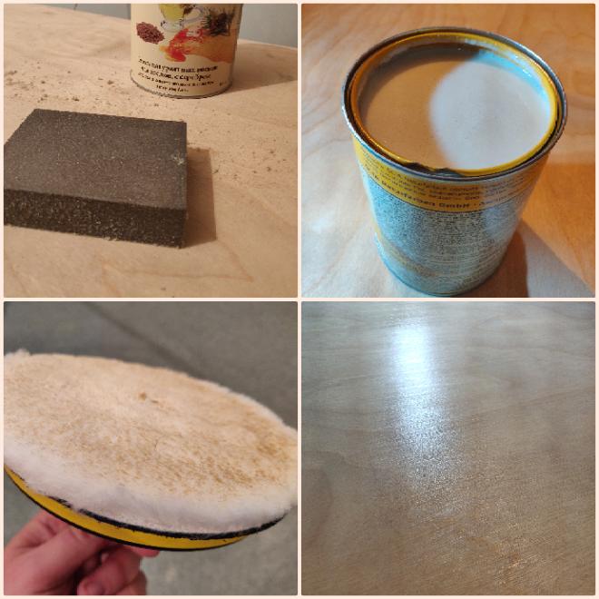 1. Предварительно прошёлся по фанере образивной губкой. Снял верхний слой добившись гладкости поверхности.