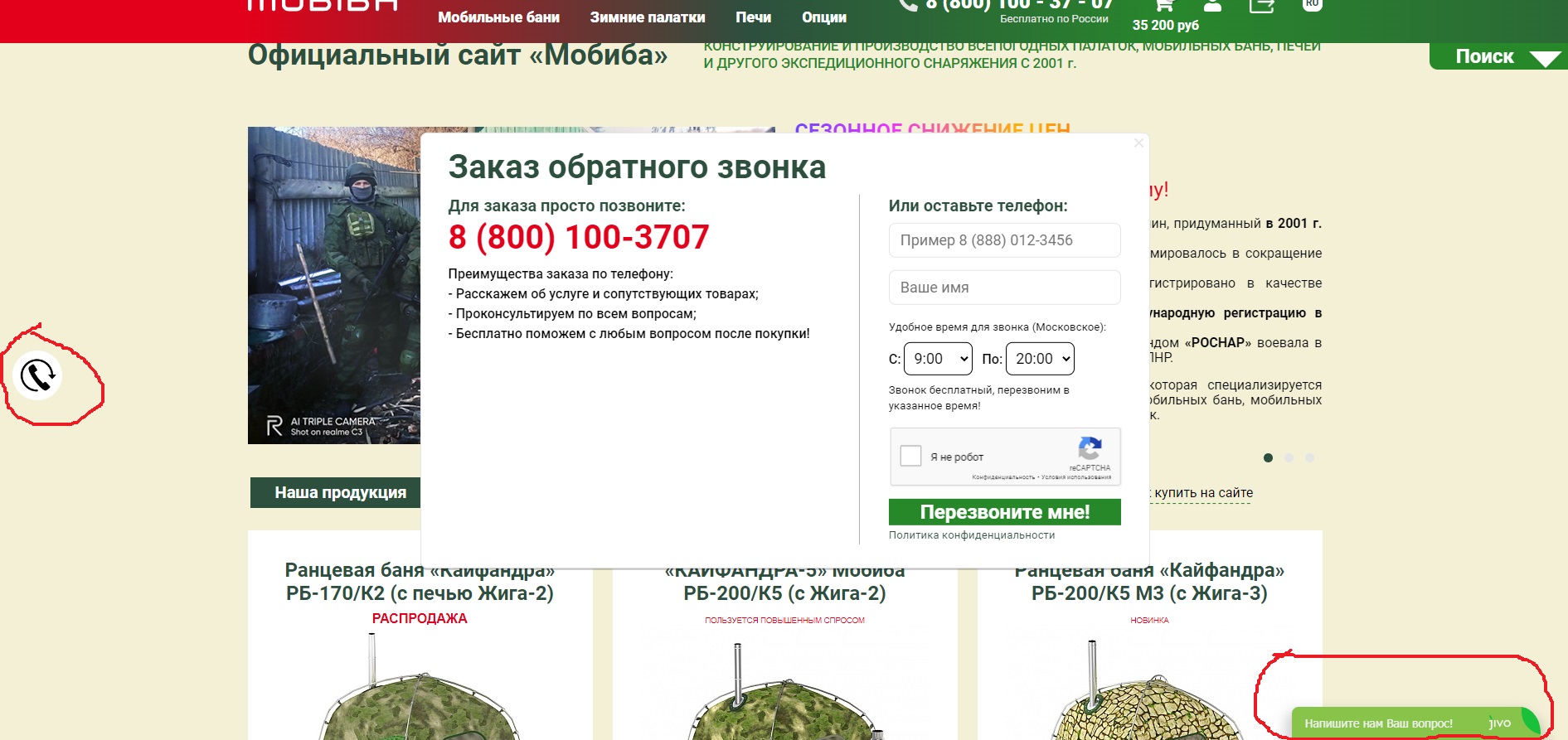 А также в левой части страниц сайта висит кнопочка с изображением телефонной трубки. По ней вы можете заказать обратный звонок.