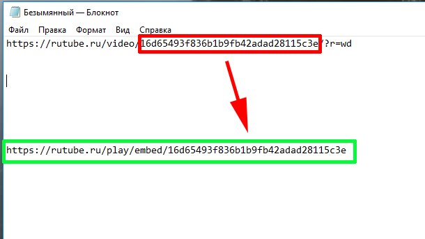 Полученную ссылку вставляем в текстовый редактор. Далее из ссылки копируется код, выделенный красным и делается новая ссылка, которая на скрине выделена зелёным цветом. Это нужная ссылка, которую нужно вставить в сообщение между тегами rutube.